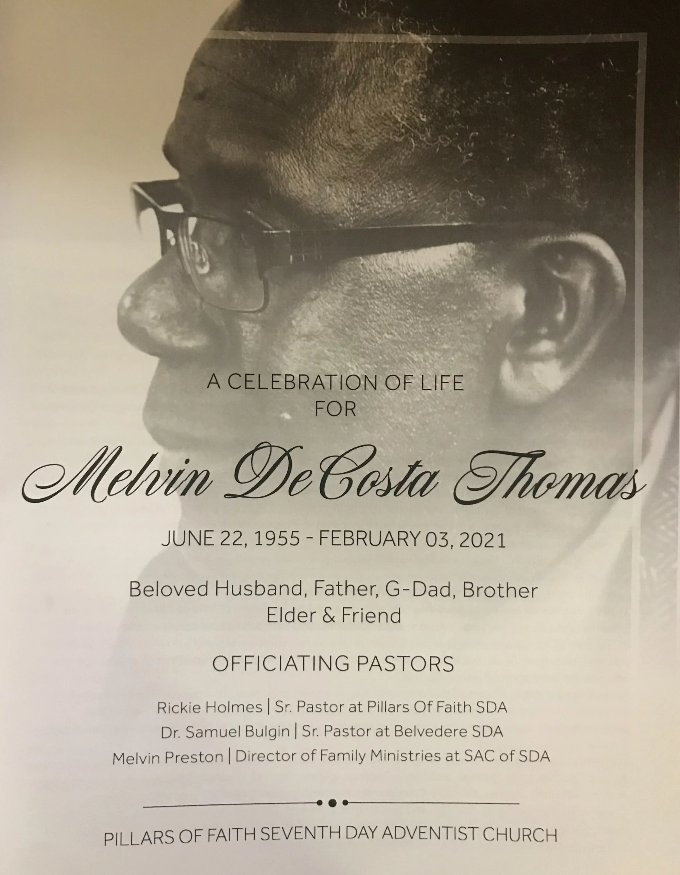 Celebration of Life for Elder Melvin DeCosta Thomas Sunday, February 21, 2021 11:00 AM 12:00 PM 11:00 12:00 Pillars of Faith SDA Church 3220 Bouldercrest Road Ellenwood, GA 30294 United States (map) Google Calendar ICS